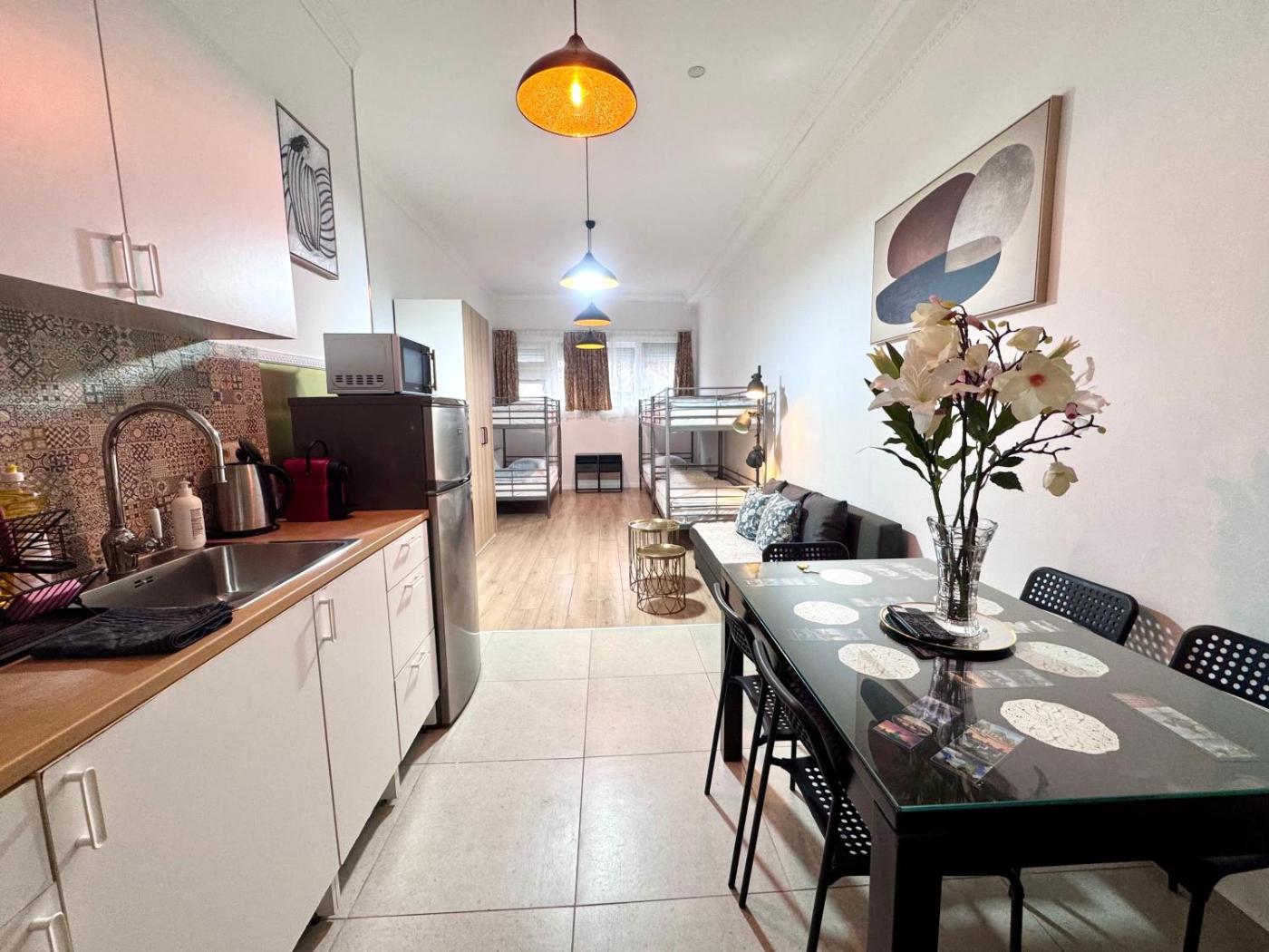Studio Apartment. The apartment features 1 bedroom and 1 bathroom with a shower and free toiletries. In the kitchen, guests will find a stovetop, a refrigerator, kitchenware and a microwave. This apartment has a tea and coffee maker, flat-screen TV with cable channels, city views, as well as chocolate for guests. The unit offers 4 beds.